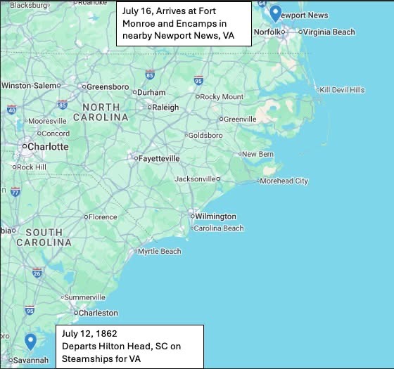 Saturday, July 12th, 1862. The Regiment departed Hilton Head SC on steamships headed for Virginia.