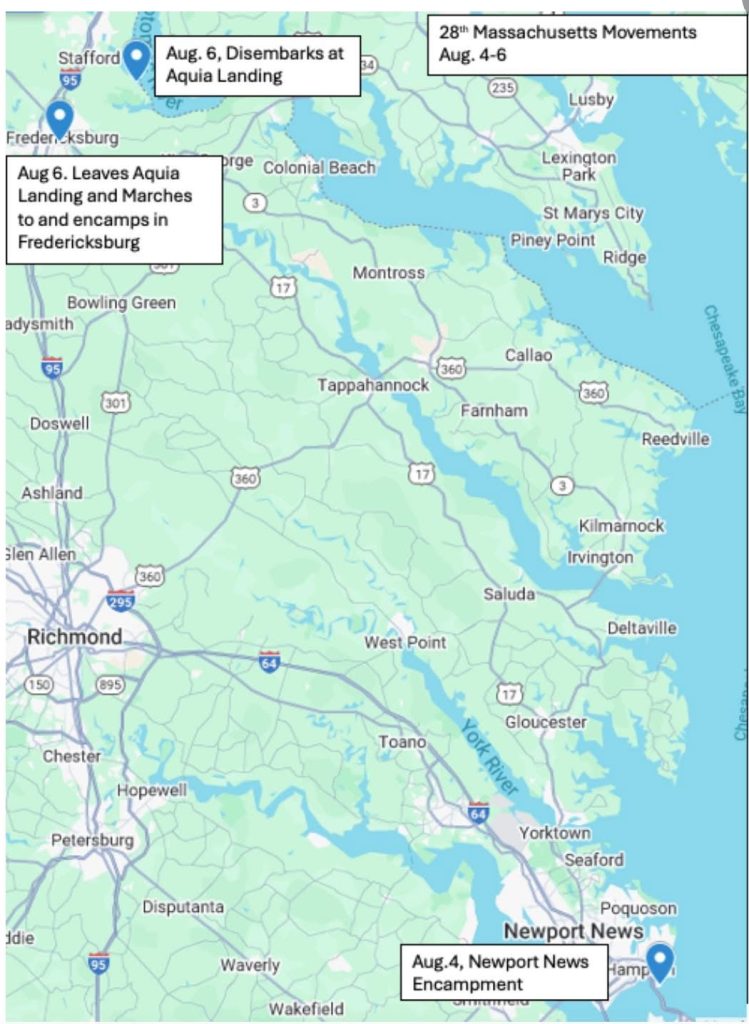 Monday, August 4th, 1862. The 28th Massachusetts boarded on steamships in the Hampton Roads and embarked for Aquia Landing on the Potomac River. They will spend the next two days on the ships until the 6th where they will disembark and march about 10 miles before encamping in Fredericksburg.