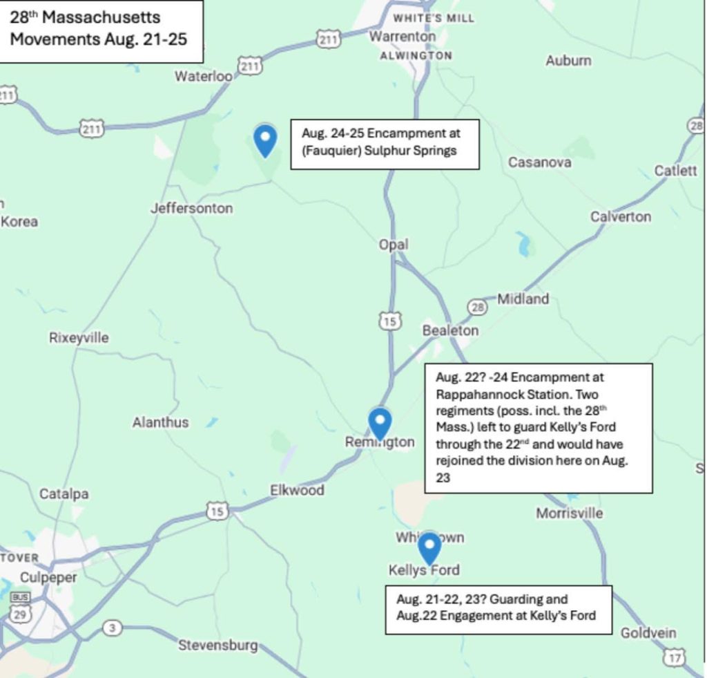 Over the next few days, the 28th Massachusetts would march northwest along the trace of modern Rt. 17 up to Bealeton and then south along modern Rt. 15 to encamp at the river crossing at Rappahannock Station. Then the following day (August 15th), the Regiment would move towards Pope’s forces near Culpeper, VA.