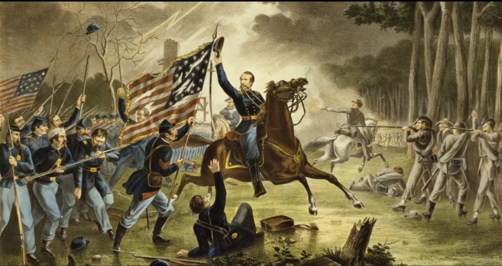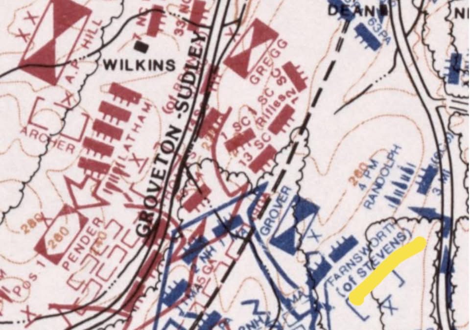 The attack meets heavy resistance… Hazard Stevens wrote of his father Gen. Stevens “… at once becomes furiously engaged, and suffers heavy loss, including Colonel Farnsworth, who is severely wounded. General Stevens maintains this contest until Porter’s column is repulsed, when he withdraws his command to the first ridge in rear of the woods, posting his lines just behind the crest, with skirmishers holding the edge of the woods.”
