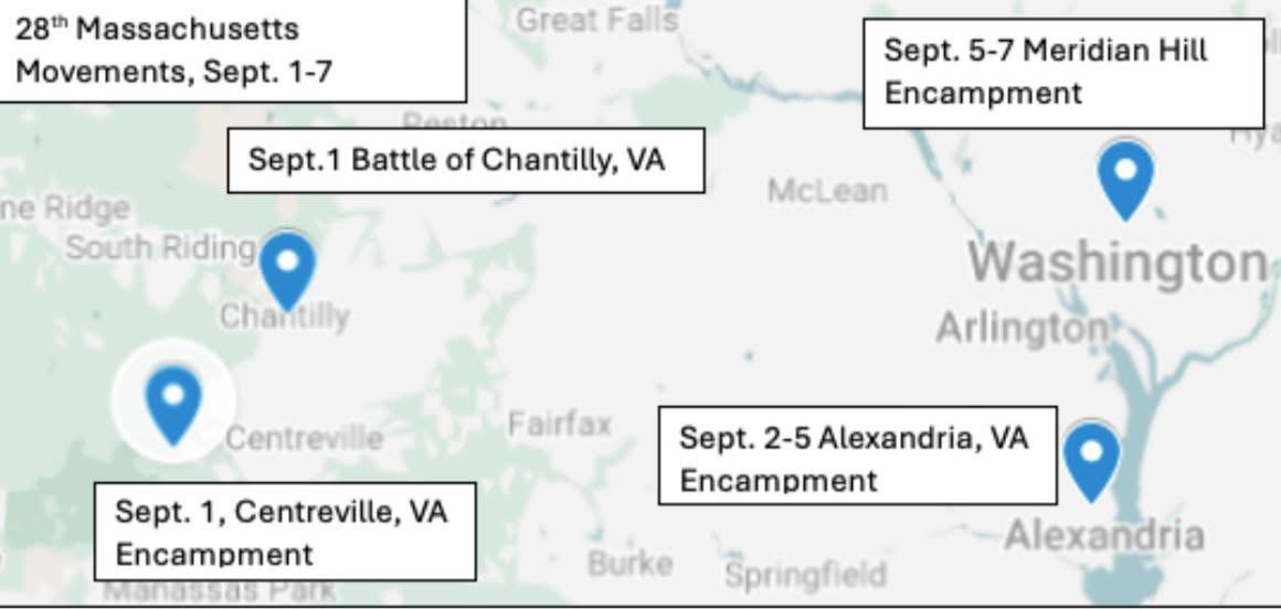 Tuesday, September 2nd, 1962. After spending the night of Sept. 1st on the Chantilly Battlefield, the 28th Massachusetts and the rest of the division pulled back to encamp in Alexandria, Va, where they would stay until the early morning hours of Sept. 5.