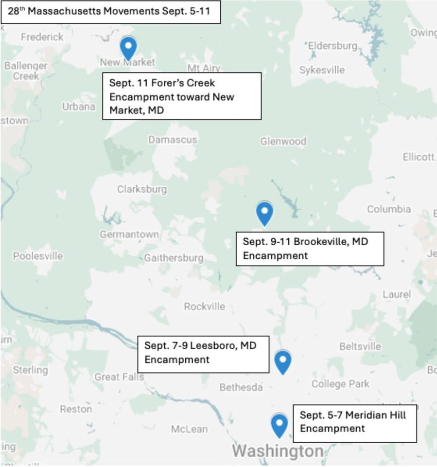 Sunday, September 7th, 1862. The main body of the Army of Northern Virginia crosses into Maryland. The Federal Army of the Potomac under Major General George McClellan begins northerly movement in pursuit of the invading Confederates. What would be later dubbed “the Maryland Campaign” had begun. As part of the Army of Potomac’s chase, the 28th Massachusetts left Camp Cameron, marching north into Maryland.