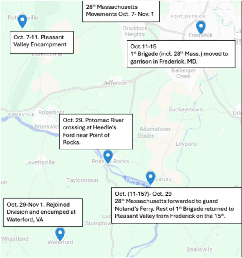 Sometime during this period the 28th Massachusetts continued toward the C&O Canal to guard Noland’s Ferry. The Regiment would stay at Noland’s Ferry until Oct. 29th.