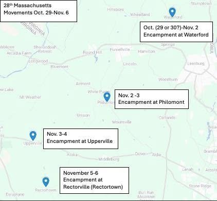 After crossing into Virginia the 28th Massachusetts would march for another 10 miles to rejoin the rest of the Division at Waterford, VA. This is where they would encamp until Nov. 1st.