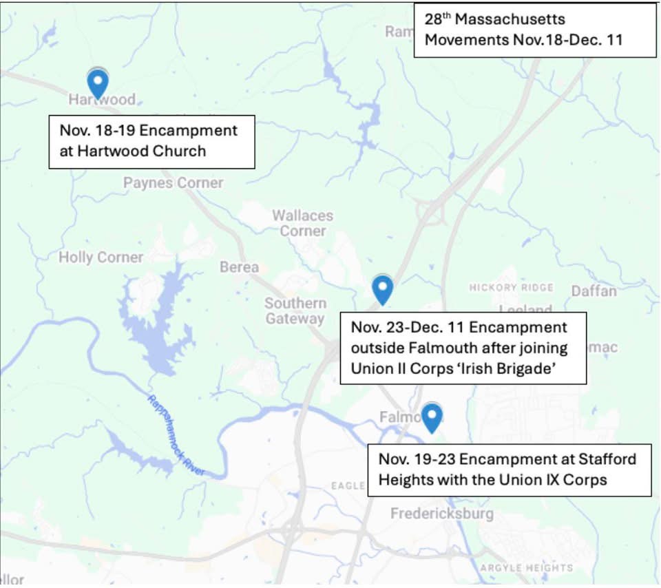 Wednesday, November 19th, 1862. On November 19th, the 28th Massachusetts had marched the remaining 10 miles and settled into Stafford Heights overlooking the city of Fredericksburg.