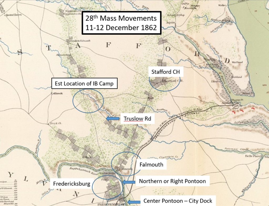Thursday, December 11th, 1862. The 28th Mass broke their camp about a mile-and-a-half from Falmouth before daylight and proceeded in the direction of Stafford Heights in front of Fredericksburg, keeping out of sight of the Confederates.