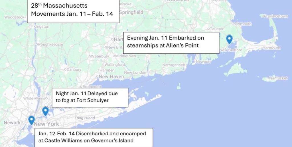 Saturday, January 11th, 1862. The 28th Mass. marched out of Camp Cameron and made their way via a procession to the Boston Common. The city had prepared a dinner for them on the Common. After the dinner, the Regiment made their way to the railroad and was transported to Allen’s Point, where they boarded steamships to New York.