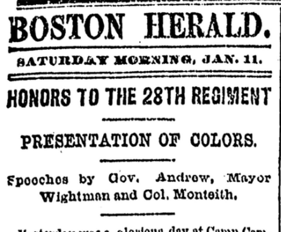 The event was accompanied by speeches from the Massachusetts Governor John A Andrew, Boston Mayor Joseph Wightman, and lastly by Col. William Monteith, the first Commanding Officer of the 28th Mass. A number of other local luminaries attended as well.