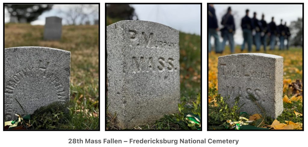 After the end of the Civil War, Congress authorized a National Cemetery atop Maryes Heights in Fredericksburg. More than 15,000 Federal soldiers rest there, including three from the 28th Mass, one of which – Private Thomas Lynch, 33 of Boston – died from wounds received in the battle. Of the 15,000 plus, only the names of about 20% rest under a gravestone bearing their name and Regiment. To each one we pray the traditional Irish prayer “Ar dheis Dé go raibh a anam” – “May his soul be at God’s right hand.”