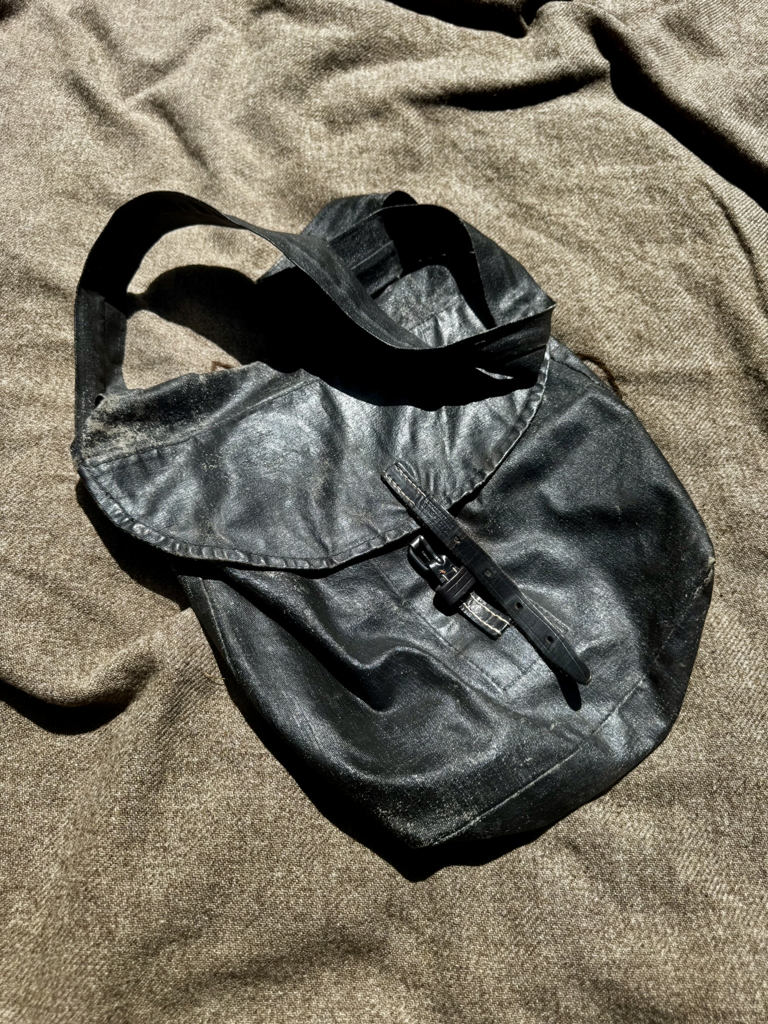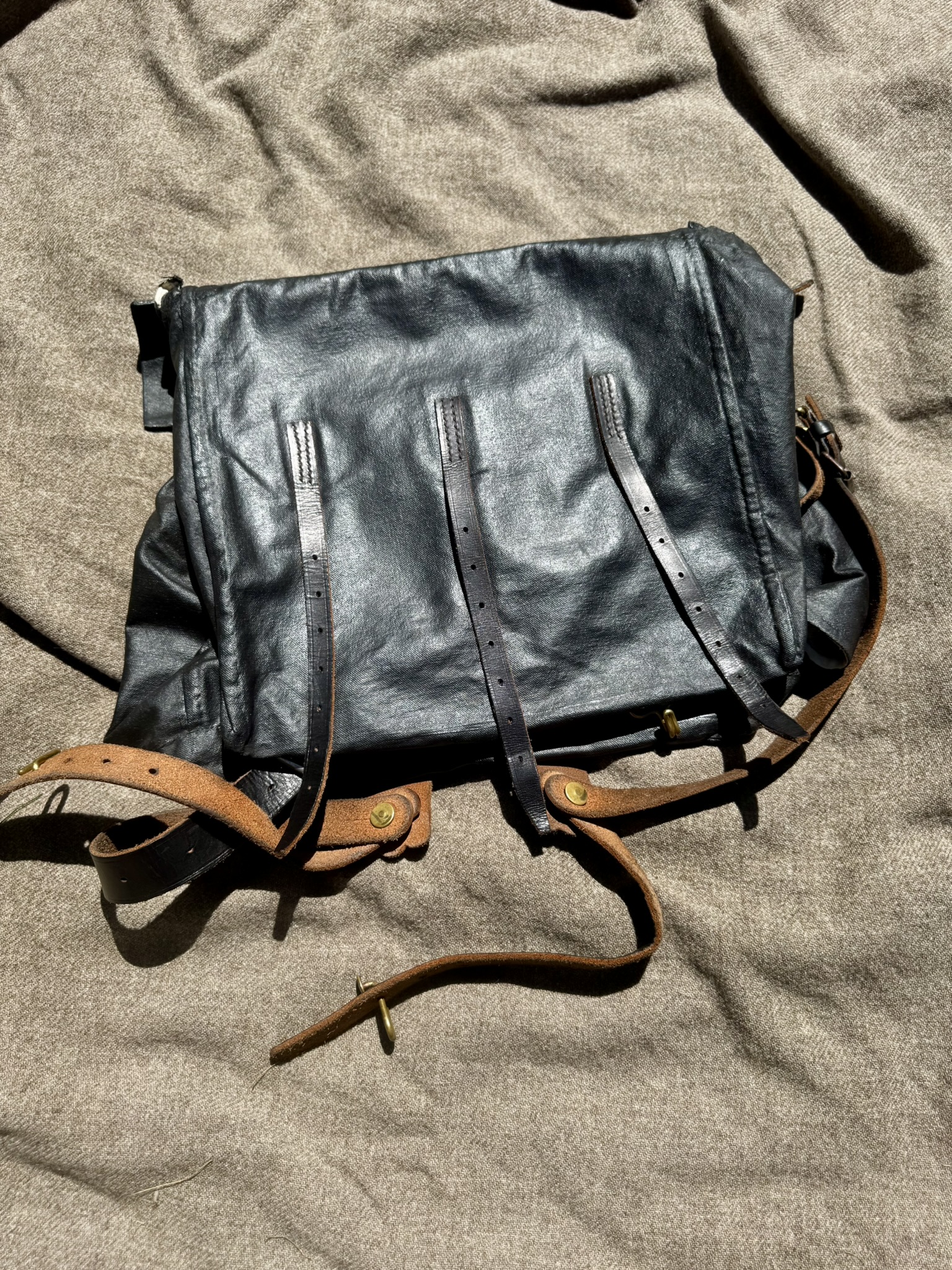 Preferred: Federal issue two-bag knapsack of black-tarred canvas.