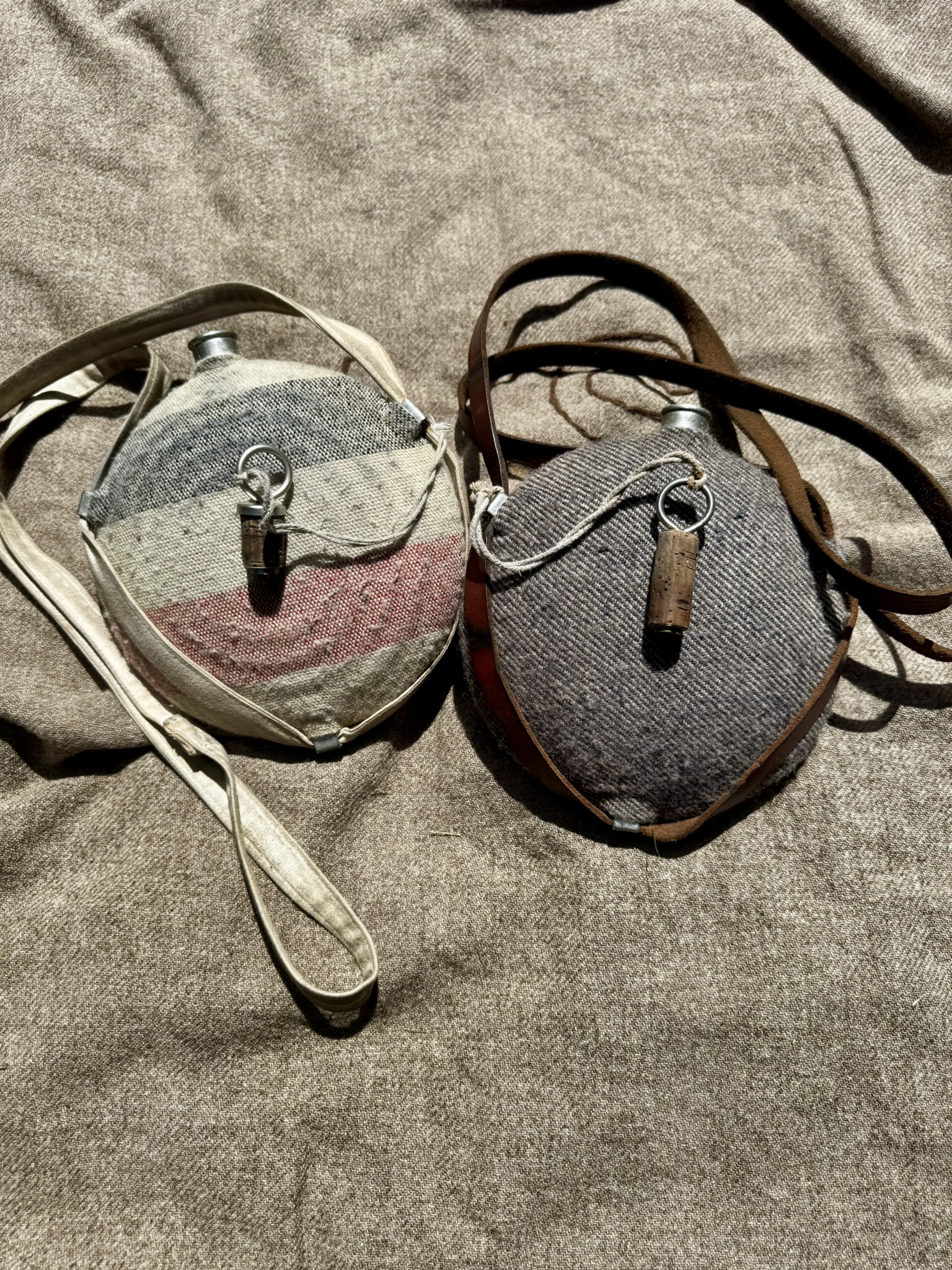 New York Depot; (if you have own canteen, this should be it); cotton drill strap, metal cork chain, jean cloth cover (gray or light blue), cork stopper with a rounded brass nut topped with a domed tin washer. (Photo courtesy of The Oblate Spheroid, on Facebook)